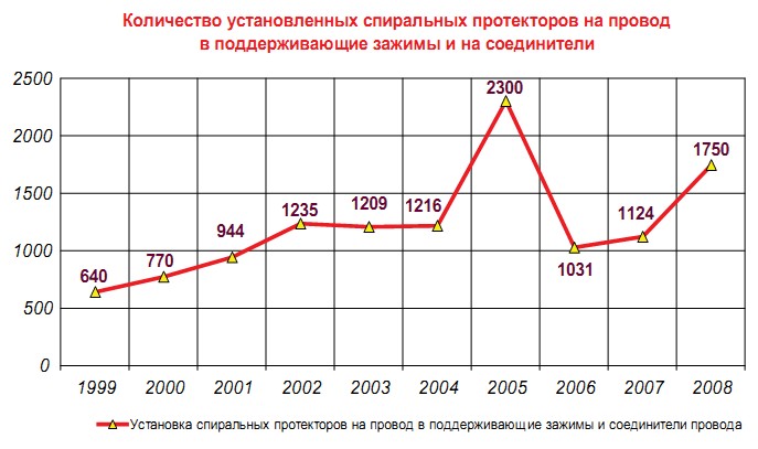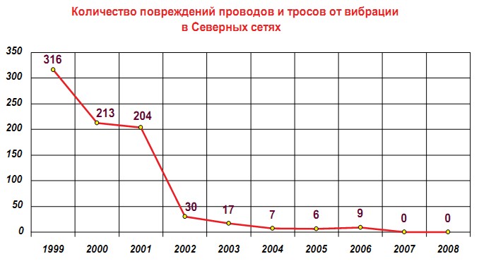 Достигнута устойчивая тенденция к снижению повреждений проводов и грозотросов по причине вибрационного износа, что позволило практически полностью исключить аварийные отключения ВЛ по этой причине и перевести проблему из плоскости авральных ремонтов в плоскость планового техобслуживания.