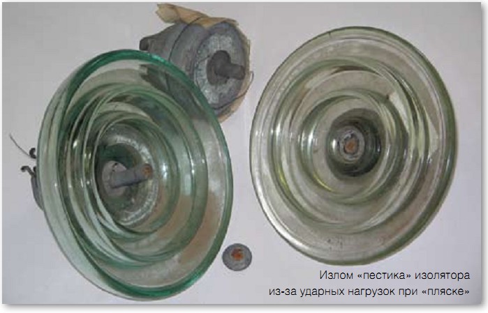 В процессе «пляски» провода и линейная арматура испытывает действия значительных циклических (пульсирующих) поперечных и продольных нагрузок, величина которых достигает 1–4 т и более. Следствием длительного воздействия таких нагрузок является разрушение подвесной и сцепной арматуры, повреждения междуфазных распорок, защитной арматуры, повреждения и обрывы проводов и грозозащитных тросов.