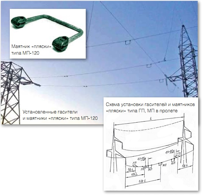 Для борьбы с «пляской» проводов активными средствами, с целью наработки практического опыта эксплуатации различных типов гасителей «пляски», в филиале ОАО «Тюменьэнерго» Северные электрические сети начиная с 2003г. было установлено несколько типов гасителей «пляски»: разработанных ОАО «ВНИИЭ», принцип работы которых направлен на препятствование и уменьшение крутильных колебаний провода.