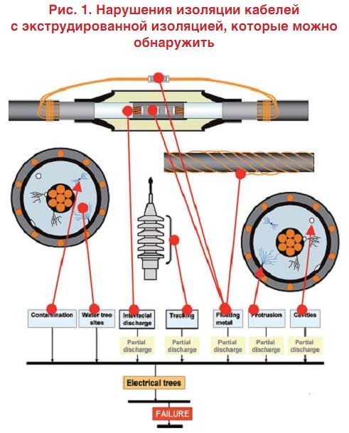 Большинство повреждений кабельных систем с экструдированной изоляцией связано с образованием древовидного пробоя в результате воздействия воды (водным триингом), что приводит к повреждению с преобразованием [1] в электрический триинг. Водный триинг — это незначительное ухудшение состояния, которое происходит в результате комплексного воздействия электрических полей переменного тока и водных растворов солей от заполненных электролитом пустот, соединённых узкими порами через аморфные области (области с ухудшившимися свойствами) полимера. Давление, наведённое полем, заталкивает гидратированные ионы в полимер. В результате электрохимической реакции (разрыв связей при окислении) и перегруппировки полимерной цепи в областях с низкой плотностью (аморфной областью) образуются микропоры. Электрический триинг представляет собой деградацию высокого уровня, которая растёт от областей с повышенными электрическими напряжениями переменного/постоянного тока (т.е. шероховатости металлических поверхностей, нарушения структуры и проводимости) в непосредственной близости от водного триинга кабельной изоляции. Формирование электрического триинга может быть результатом частичных разрядов в больших пустотах в материале изоляции, кабельных муфтах и соединениях. Момент преобразования водного триинга в электрический занимает очень короткий период времени до повреждения, поскольку начавшийся электрический триинг распространяется по ослабленной изоляции с большой скоростью. Таким образом, стандартным выходом для локализации частичного разряда является процесс преобразования. В нормальных условиях такое преобразование вызвано продолжительной активностью, инициированной в водном триинге, в изоляционных полостях, и при помощи технологий In situ («на месте») можно выявить такую активность. На рис. 1 показаны участки деградации, которая возможна в стареющих кабельных системах с экструдированной изоляцией. Технологии In situ (CableWISE) способны выявить, определить местоположение и произвести оценку таких участков. Если не предпринять никаких мер противодействия, на большинстве участков деградации могут развиться в электрические триинги.