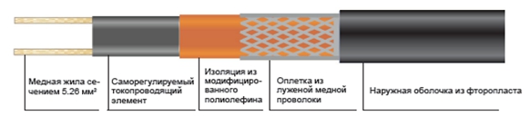 Для достижения этого свойства в конструкции саморегулирующихся нагревательных лент применяется специально разработанная нагревательная матрица.