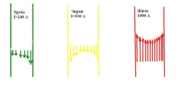 Электромагнитное поле, возникащее при передаче переменного тока по кабелю имеет как электрическую, так и магнитную составляющую поля. Эллектрическая составляющая поля не выходит за пределы экрана из медных проволок, на распространения магнитной составляющей на промышленной частоте тока медный экран практически никакого влияния не оказывает.Если расположить одну фазу кабеля в трубе из ферромагнетика (сталь) то изменение магнитного потока пронизывающего трубу вызовет большие потери при протекании вихревых токов в стали и сильный нагрев трубы. ...