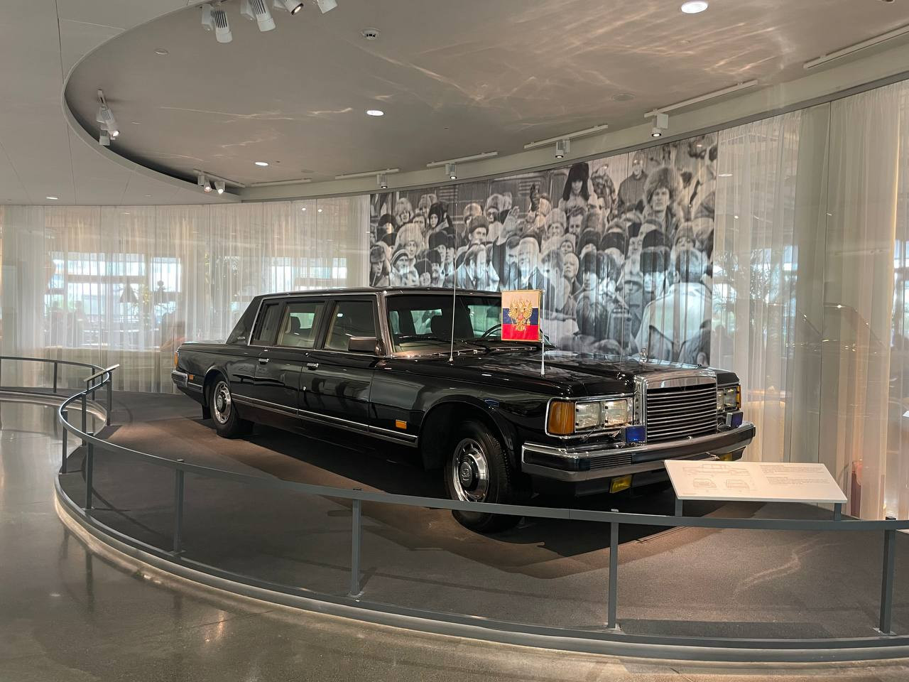 29 июл. 2024, 14:21Прямо на входе (еще до музея) нас встречает платформа с автомобилем Ельцина ГАЗ-14 «Чайка». Первый экспонат стоит как-будто новый кроссовер на продажу где-то в торговом центре. Формально огороженный ленточкой лимузин можно хорошо рассмотреть, заглянуть в стекло и понять, что современные машины даже среднего класса очень далеко ушли вперед.