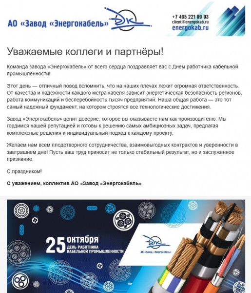 25 окт. 2025, 15:20Рассылка от ЭНЕРГОКАБЕЛЯУважаемые коллеги и партнёры!Команда завода «Энергокабель» от всего сердца поздравляет вас с Днем работника кабельной промышленности!
