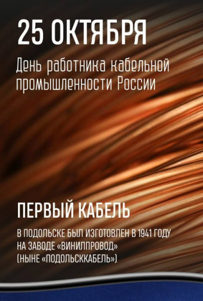 Передача электрической энергии, сигналов сотовой связи, запуск ракет в космос – все это не представляется возможным без применения кабеля. В этот день мы хотим поздравить специалистов разных направлений нашей отрасли, которых объединяет одно: стремление внести свой вклад в развитие кабельной промышленности.Изо дня в день специалисты–кабельщики занимаются исследованиями, испытаниями, внедрением новых технологий, повышением эффективности производства на благо развития кабельной отрасли. В этот праздничный день хотелось бы сказать слова благодарности огромному коллективу сотрудников компаний и предприятий, которые занимаются разработкой, производством и поставкой кабельно-проводниковой продукции.Поздравляем всех кабельщиков с вашим профессиональным праздником!Всем работникам кабельной промышленности, желаем оптимизма и уверенности в завтрашнем дне, оставаться верными своему делу, стабильной и эффективной работы, реализации инновационных идей и всех намеченных планов!Благополучия, счастья и здоровья Вам и Вашим близким!