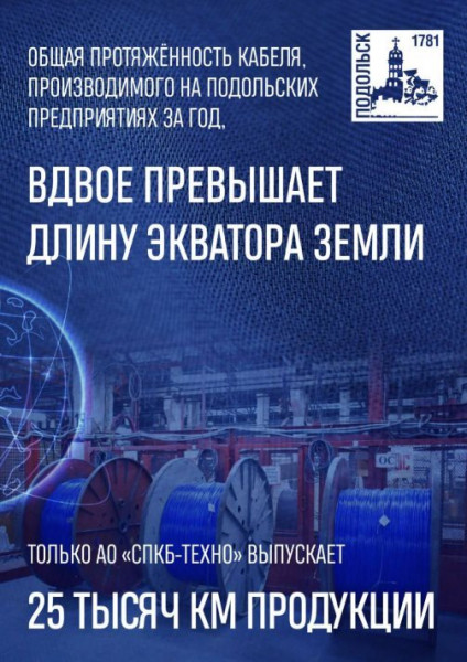 Общая протяженность кабеля, производимого на подольских предприятиях за год, вдвое превышает длину экватора земли. Только АО «СПКБ-Техно» выпускает 25 тысяч км продукции.