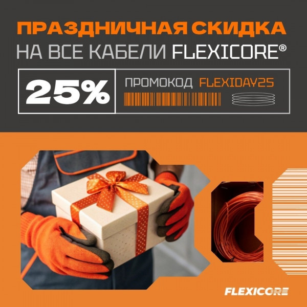 Лучшим подарком в этот день для всех работников кабельной промышленности станет вклад в реализацию идей и проектов по электромонтажу, поэтому этот праздничный промокод на скидку для вас!Только один день промокод FLEXIDAY25 обеспечит скидку 25% на все кабели FLEXICORE!Важно: промокод будет действовать ТОЛЬКО 27 октября 2025 года.Скидка не распространяется на дистрибьюторов и не суммируется с индивидуальными скидками.RusCable.Ru - все кабельщики здесь -