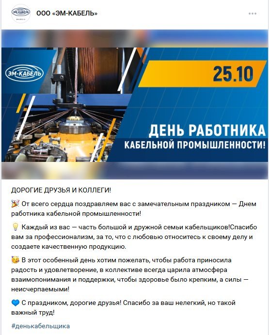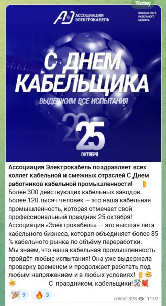 Этот день — отличный повод вспомнить, что на наших плечах лежит огромная ответственность. От качества и надежности каждого метра кабеля зависит энергетическая безопасность регионов, работа коммуникаций и бесперебойность тысяч предприятий. Наша общая работа — это тот самый надежный фундамент, на котором строятся все технологические достижения.