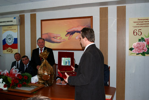 Праздничное мероприятие состояло из двух частей. Торжественная церемония проходила в конференц-зале ООО «ЛПО» Электроаппарат». Во время церемонии прозвучала речь генерального директора ООО «ЛПО» Электроаппарат» Плаксина Владимира Александровича, поздравления от представителей власти и партнеров по бизнесу. Поздравила юбиляра и наша компания, поблагодарив руководство предприятия и его персонал за годы плодотворной совместной работы и вручив памятный подарок – панно с изображением Курской Коренной Пустыни, чтобы образ святыни приносил ООО «ЛПО» Электроаппарат» и всем, кто на нем трудится, удачу и благополучие. В ответ Плаксин В.А. выразил благодарность ООО «Совтест АТЕ» за оказанную поддержку в трудные кризисные времена, когда становится четкой грань между настоящими партнерами, с которыми можно смело смотреть в будущее, и теми, для кого важнее прибыль от разовых проектов.