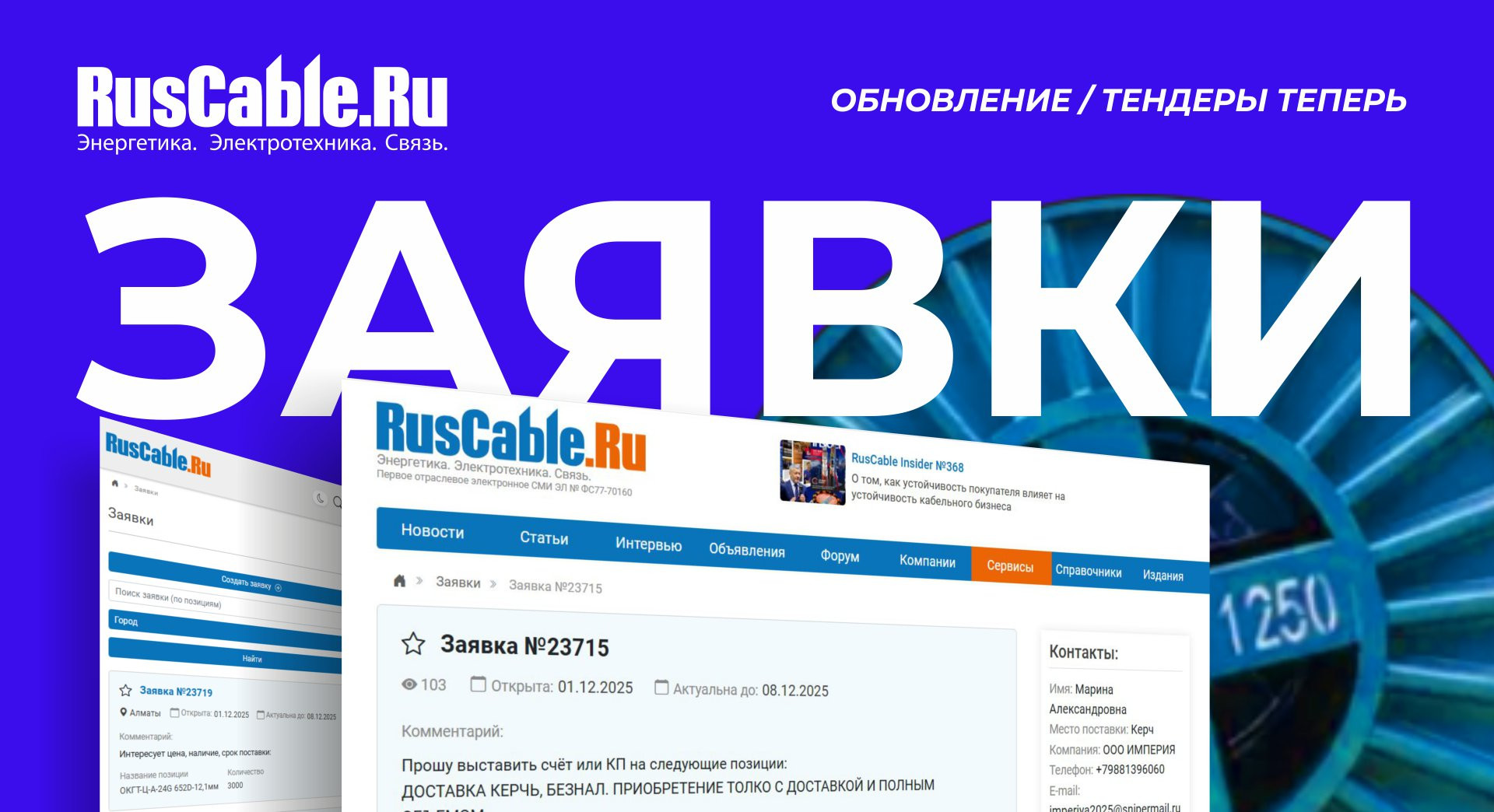 Сегодня, 2 декабря, портал RusCable.Ru представил обновлённую версию одного из своих самых давних сервисов «Тендеры» под новым названием – «Заявки». Обновление затронуло название, интерфейс и функциональность, сделав сервис ещё удобнее для всех участников кабельного рынка.