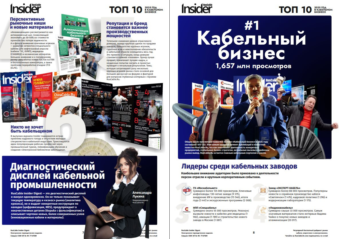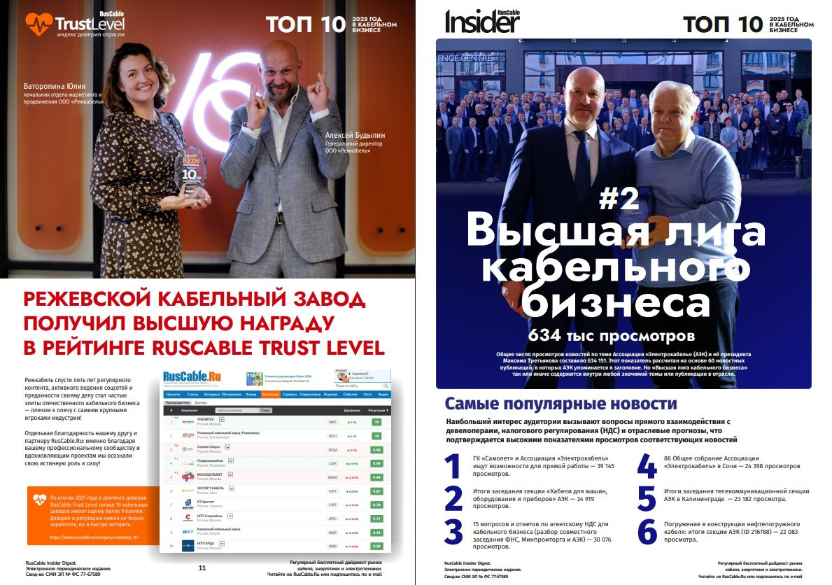 Поздравляем, мы в полном ТОПе 2025 года! Редакция RusCable Insider проанализировала 9213 новостей за 2025 год, объединила темы в сюжеты и посчитала общую статистику материалов, чтобы определить главные новости, события, тренды и персоны 2025 года. Оказалось, что за огромным массивом информации можно не просто найти «популярное», но и увидеть тренды и болевые точки кабельной отрасли. Главные итоги отрасли в одном выпуске!