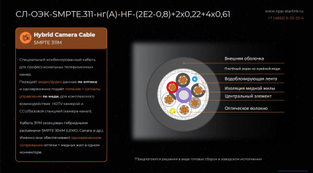 Кабельный завод НПП Старлинк в Орле запустил производство комбинированных оптоэлектрических кабелей для применения в современных системах профессионального вещания и создания контента. Комбинированные оптоэлектрические кабели СЛ-ОЭК-SMPTE.311-нг(А)-HF-(2Е2-0,8)+2х0,22+4х0,61 разработаны для одновременной передачи питания и оптического сигнала.