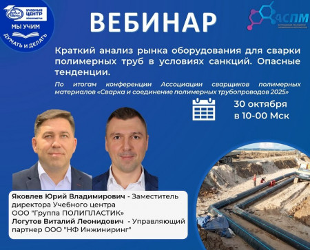 Учебный центр Группы ПОЛИПЛАСТИК совместно с Ассоциацией сварщиков полимерных материалов (АСПМ) приглашает проектировщиков, инженеров, руководителей строительных организаций, главных инженеров, а также специалистов технического надзора и служб ПТО принять участие в БЕСПЛАТНОМ вебинаре на тему «Краткий анализ рынка оборудования для сварки полимерных...