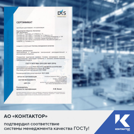 АО «Контактор» успешно подтвердило соответствие системы менеджмента качества требованиям национального стандарта ГОСТ Р ИСО 9001-2015, срок действия сертификата продлен. Это означает, что предприятие соответствует высоким стандартам качества и обеспечивает надежность выпускаемой продукции.