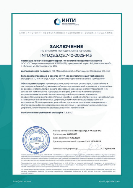 «ССТэнергомонтаж» (входит в Группу компаний «Специальные системы и технологии»), крупнейшая российская инжиниринговая компания, специализирующаяся на комплексных решениях в сфере систем электрообогрева и промышленной безопасности, получила заключение АНО «Институт нефтегазовых технологических инициатив» (ИНТИ) о соответствии системы менеджмента кач...